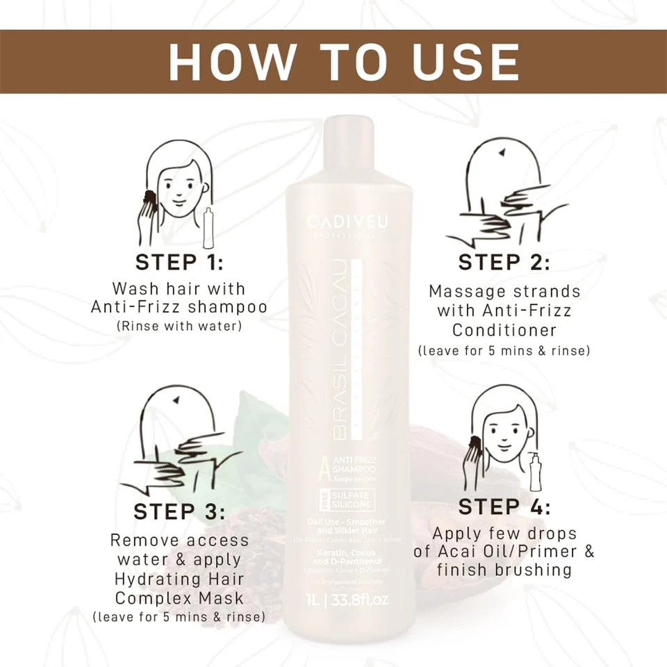 Apply to hair and massage from roots to tips. Massaging time depends on hair type and thickness. Rinse out and apply the Cadiveu Professional Brasil Cacau Anti Frizz Conditioner.