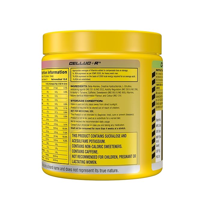 Beta-Alanine, Creatine Hydrochloride, L- Citrulline, Anticaking agent (INS 551 & INS 552), N-Acetyl-L-Tyrosine, Caffeine, Vitamins^, Nature identical Orange Flavour, Acidity Regulator (INS 330), Sweeteners (INS 950 & INS 955), Colour (INS 160a(i))