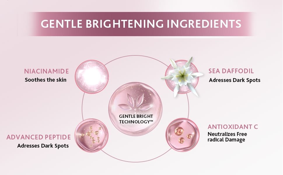 - NEXT GENERATION GENTLEBRIGHT TECHNOLOGY: Niacinamide (vitamin B3), Sea daffodil, and now with Antioxidant C and Advanced Peptide for clinically proven results in as fast as 14 days DERMATOLOGIST TESTED ON SENSITIVE SKIN: Hypoallergenic, fragrance free and non-comedogenic formula. Clinically proven to respect even the most sensitive skin DEFENDS AGAINST 5 SIGNS OF SKIN SENSITIVITY: Dryness, irritation, roughness, tightness and a weakened skin barrier”