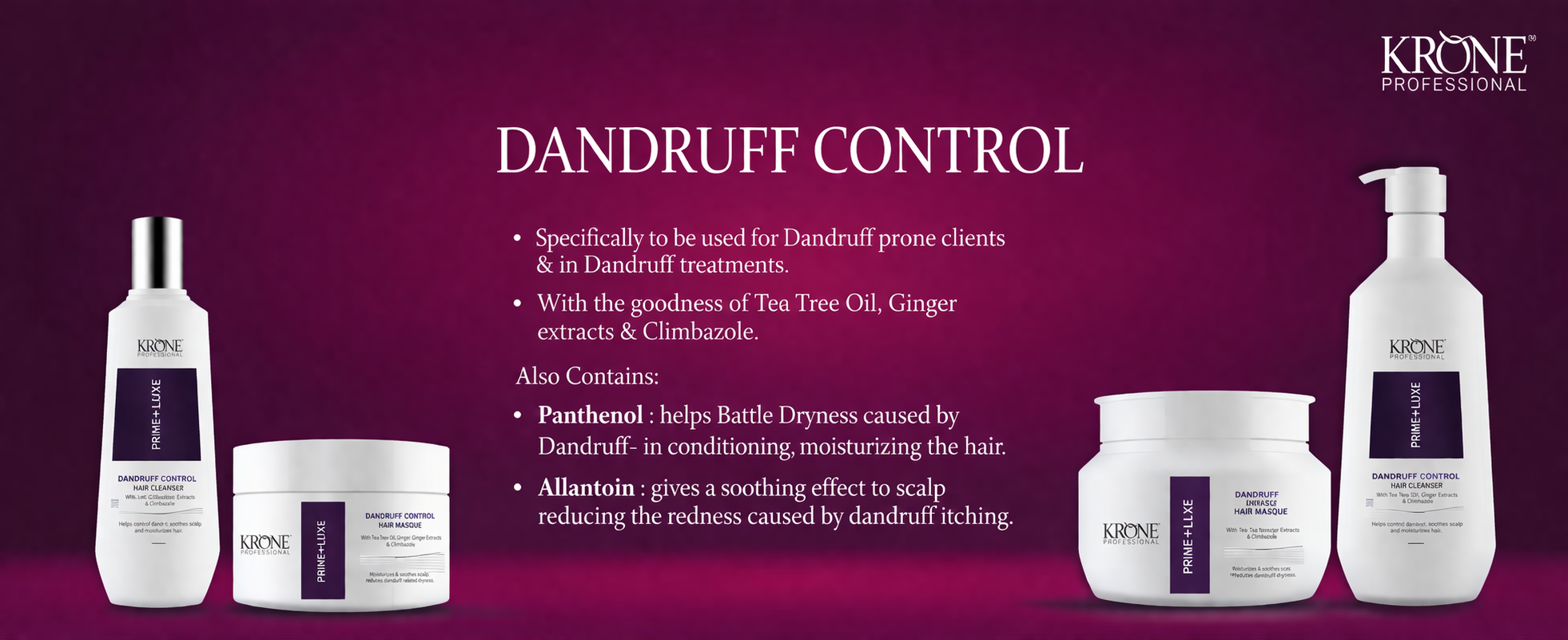Krone Professional Prime Luxe Dandruff Control Hair Cleanser and Masque offer a comprehensive solution to dandruff woes. Formulated with potent ingredients, these products work synergistically to cleanse the scalp, soothe irritation, and nourish the hair for a healthier, flake-free appearance.