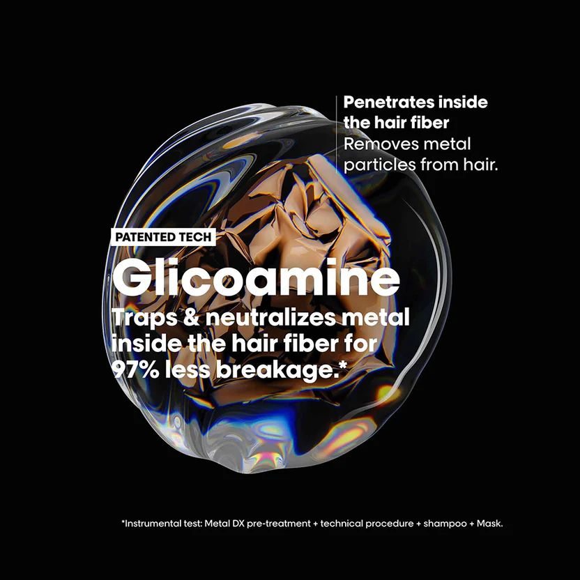 - **Instrumental test: Metal DX Shampoo + Mask A patented technology, enriched with Glicoamine, the molecule that helps trap & neutralize metal* inside the fiber.