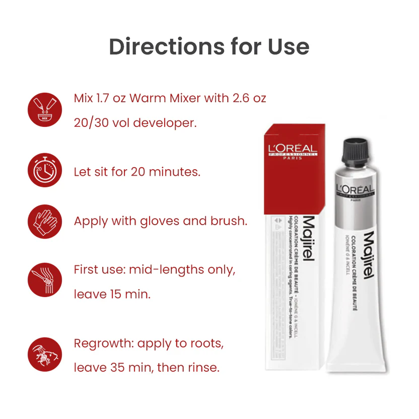• Mix: Combine the color tube (49.5g) with L’Oréal developer in a 1:1.5 ratio (1 part color, 1.5 parts developer) in a non-metallic bowl. For vibrant fashion shades, use a 20-volume developer for minimal lift or 30-volume for more significant lift