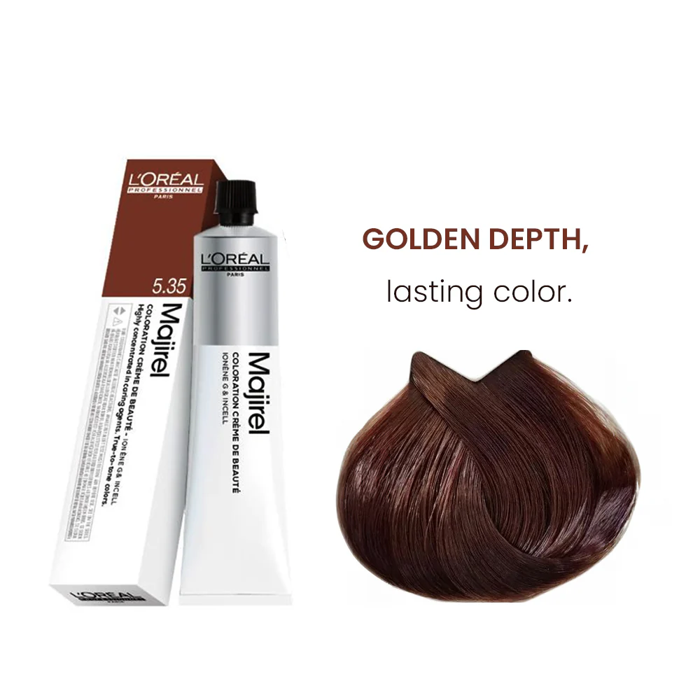 L’Oréal Professionnel Majirel 5.35 Mahogany Golden Brown is a premium permanent hair color that delivers rich, vibrant, and long-lasting results. Formulated with Ionène G™ and Incell™ technology, it deeply nourishes and strengthens the hair while providing 100% grey coverage and a glossy finish. This shade combines warm mahogany tones with a golden touch, creating a multi-dimensional brown color that looks natural and radiant.