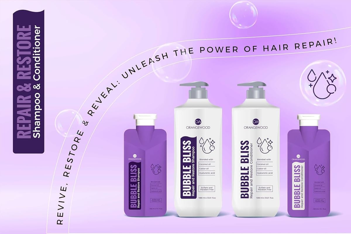 Deeply nourish and repair damaged hair with Orangewood Bubble Bliss Repair & Restore Conditioner (1L). This professional-size formula strengthens weak strands, reduces frizz, and restores softness and shine for healthier-looking hair.