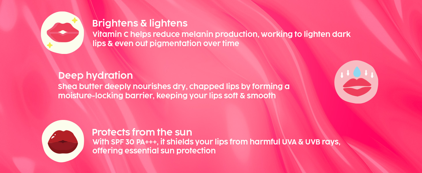 Brightens & lightens Vitamin C helps reduce melanin production, working to lighten dark lips & even out pigmentation over time
