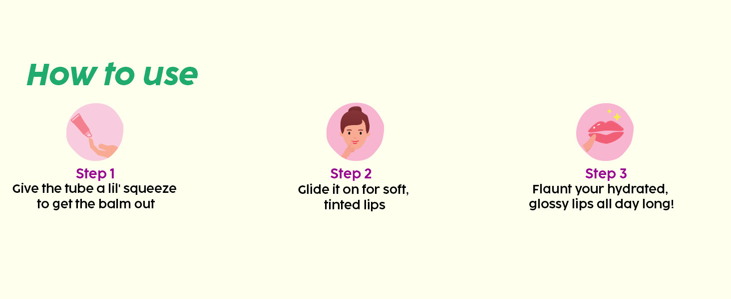 • How to use Step 1 Squeeze Give the tube a lil’ squeeze to get the balm out Step 1 Swipe Glide it on for soft, tinted lips Step 3 Slay Flaunt your hydrated, glossy lips all day long! When to use For best results, use everyday Repeat, whenever required