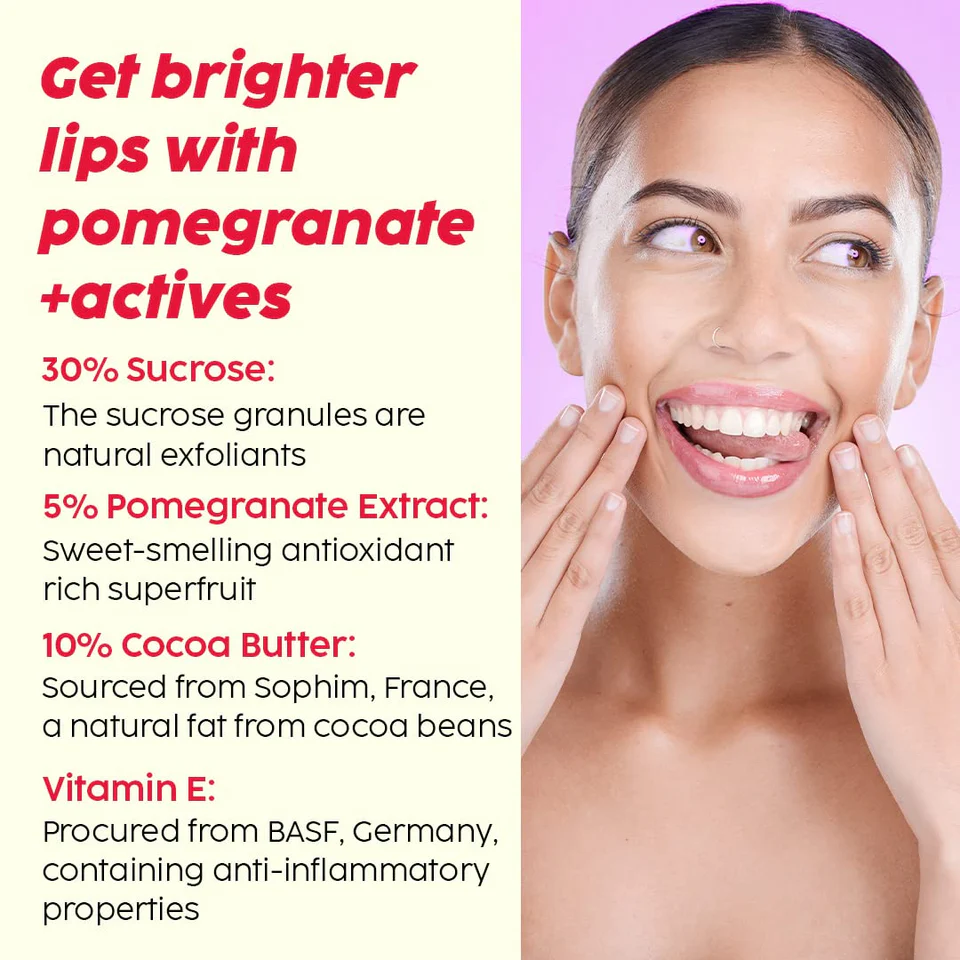 • Hydrates Lips: This Pomegranate lip exfoliating scrub aims to deeply moisturize your lips with luxurious cocoa butter that keeps dryness at bay for long hours!