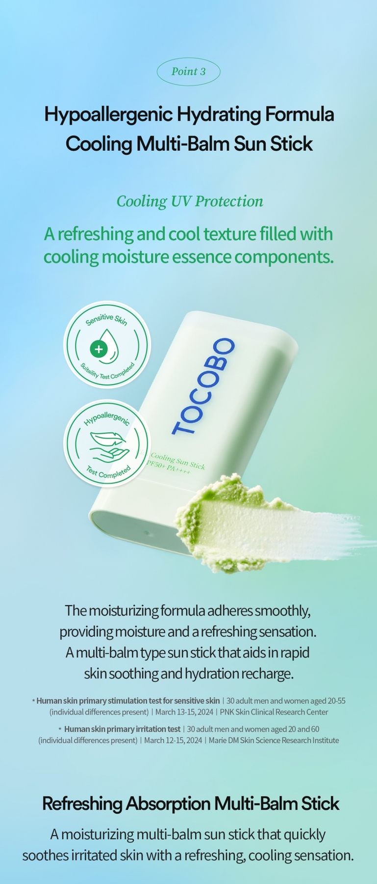 The sun protection factor is SPF50+ PA++++. The 3-sec cooling sun stick effectively soothes skin that is irritated by UV rays. Quick soothing moisture sun stick against scorching UV rays. This lightweight and moisturizing multi-balm sun stick formula is carefree on acne skin types, and provides soothing effect on heated skin. Completed test on acne skin types. Reduces body oiliness and sebum area. Non-comedogenic test completed. Refreshing and cooling texture that is rich in cooling and moisture essence. The multi-balm sun stick is complete with moisturizing formula that provides hydrating and refreshing adhesion for quick skin soothing and moisturizing. A moisturizing multi-balm product that provides cooling effect for quick soothing of irritated skin. 100% satisfaction in cooling effect, skin soothing, and moisturizing. Completed tests for acne skin types, sensitive skin types, low irritation, UV A and B blockage, and lowering skin temperature. Completely free from ingredients that may be harmful to coral reef.